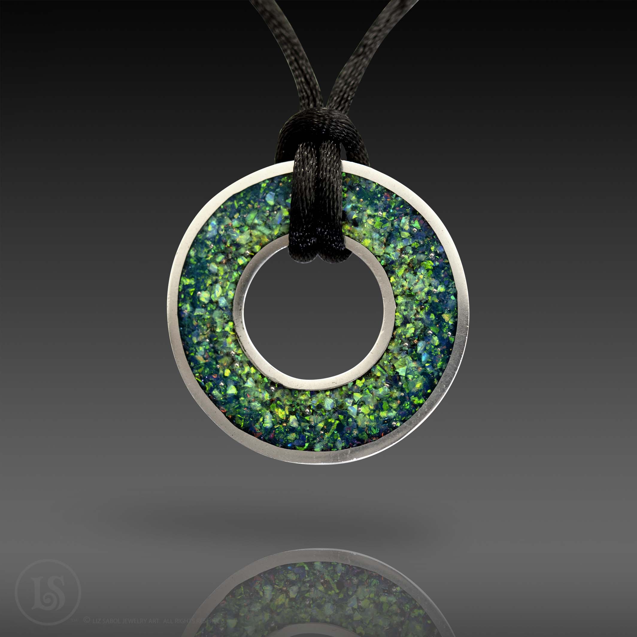 Hand-painted 960 sterling silver.  Hand-made, one-of-a-kind.  Lab Opal inlay.  Comes on an adjustable nylon cord - choker to 30".