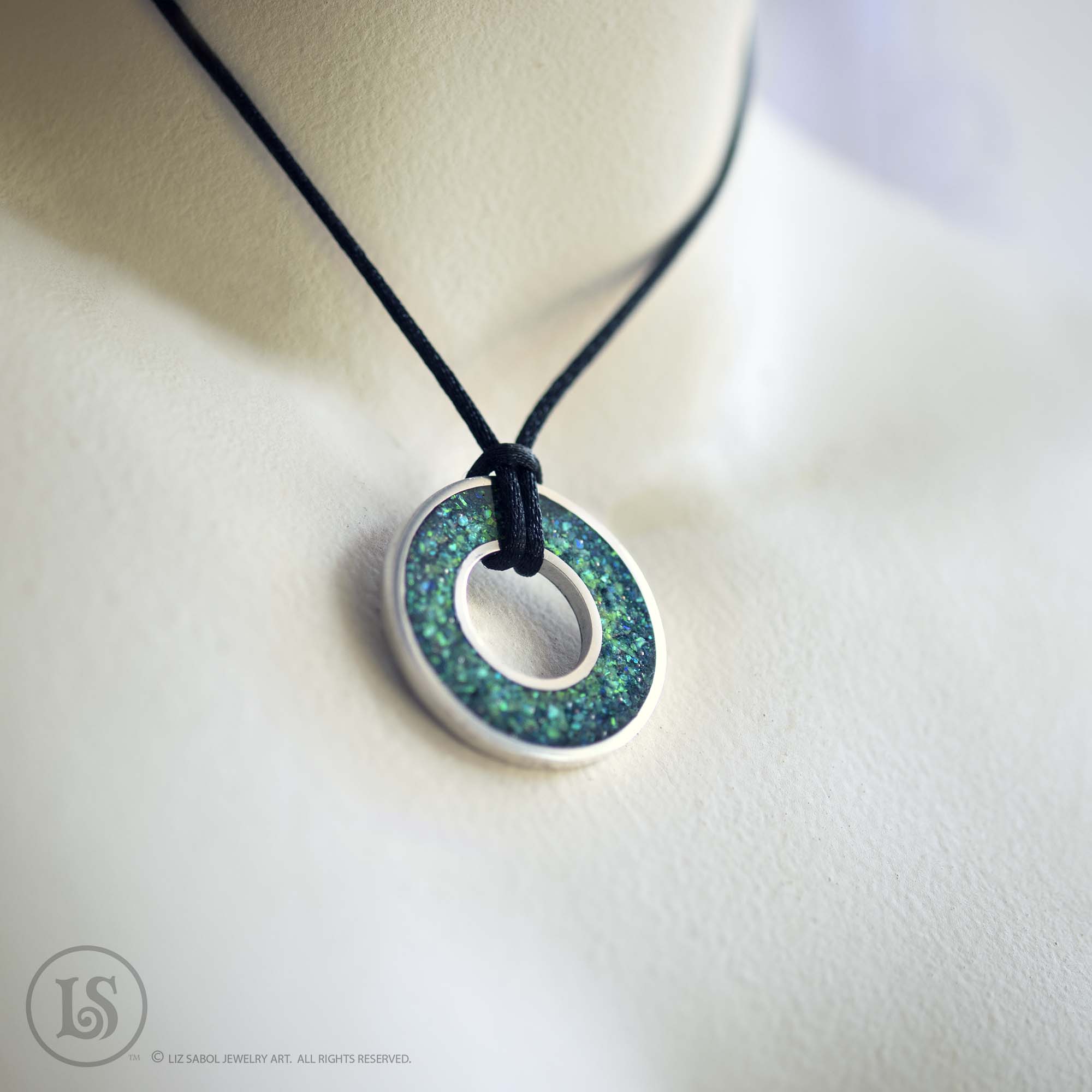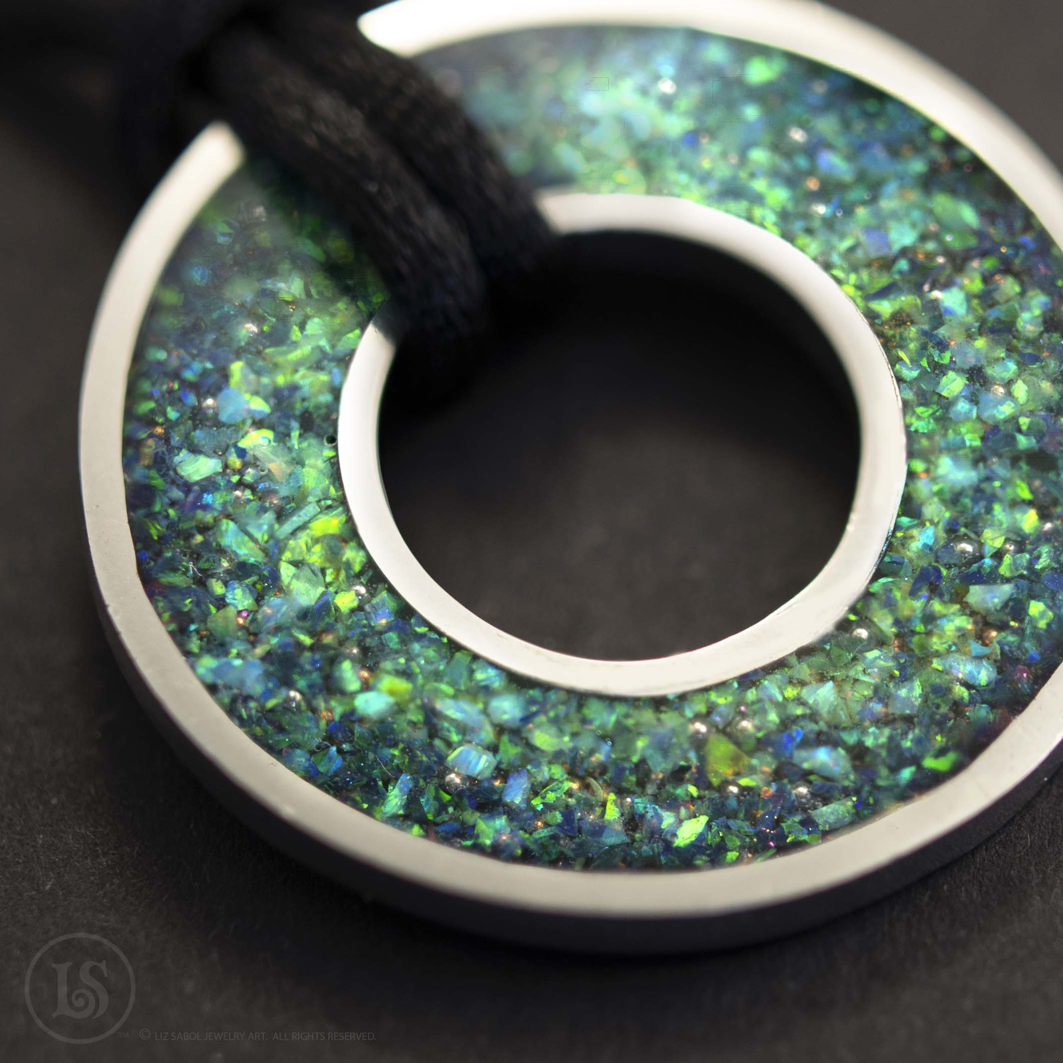 Hand-painted 960 sterling silver.  Hand-made, one-of-a-kind.  Lab Opal inlay.  Comes on an adjustable nylon cord - choker to 30".